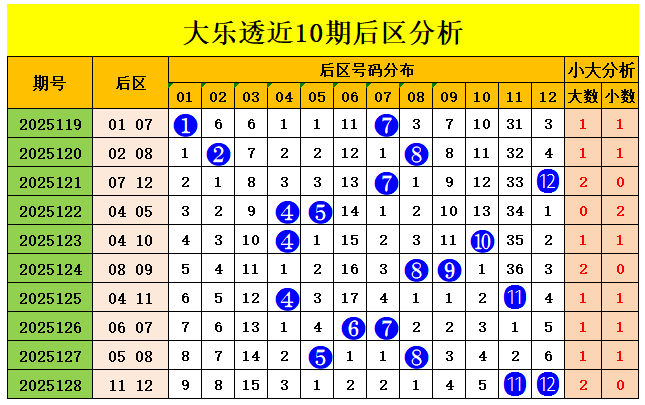 后区近10期大小比为12:8,大码奖号走势稍热,上期开出大大组合,近3期开出,小大、小大、大大、组合,本期后区推选小大组合;