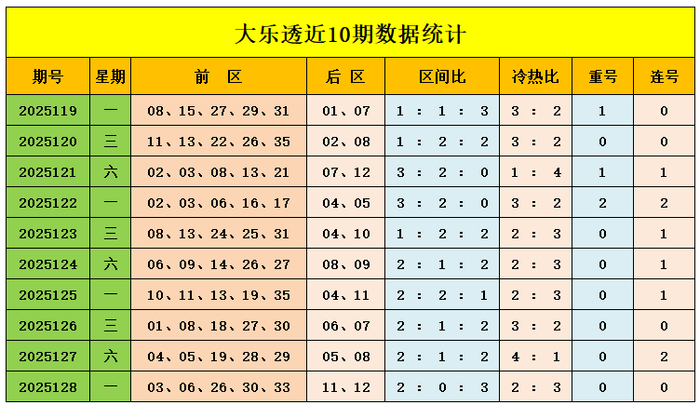 上期归来:大乐透第2025128期奖号为:前区03、06、26、30、33,后区11、12,前区奖号三区比为2:0:3,冷热比为2:3,后区开出大大组合11、12