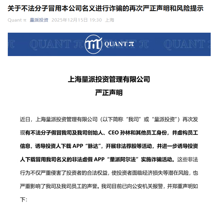 达成现在,量派投资从未开发或刊行过任何交游软件或交游步伐,全网与“上海量派投资处置有限公司”“量派阿尔法”等联系交游软件均与公司无关,系违规分子冒用公司或公司职工口头创建的糊弄器具。