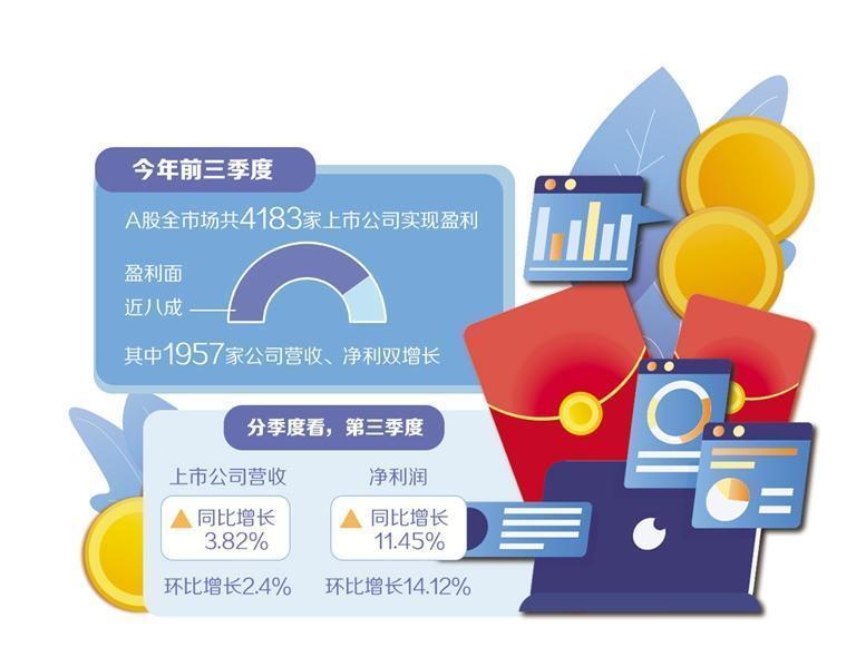 业内东谈主士暗意,走漏分成是磨练上市公司筹画质料的试金石,刻下上市公司文书鞭策的意愿浓烈,其庄重的筹画事迹、回升的盈利才气是中枢守旧。本年前三季度,A股全市集共4183家上市公司扫尾盈利,盈利面近大约,其中1957家公司营收、净利双增长。分季度看,第三季度上市公司营收、净利润同比增长3.82%、11.45%,环比增长2.4%、14.12%,逐季向好态势连接安祥。